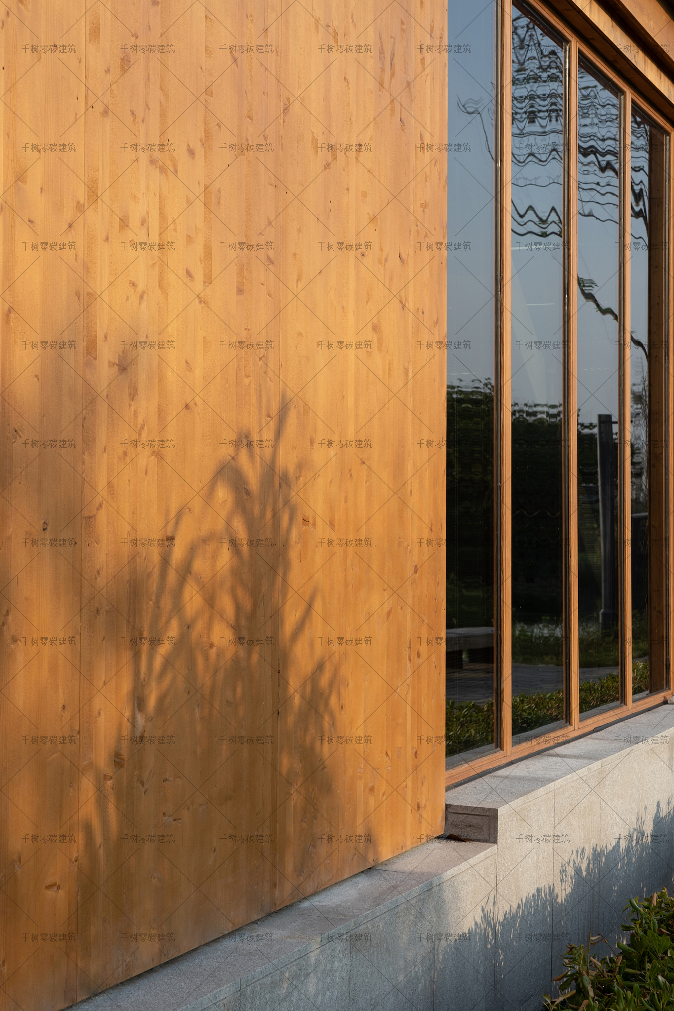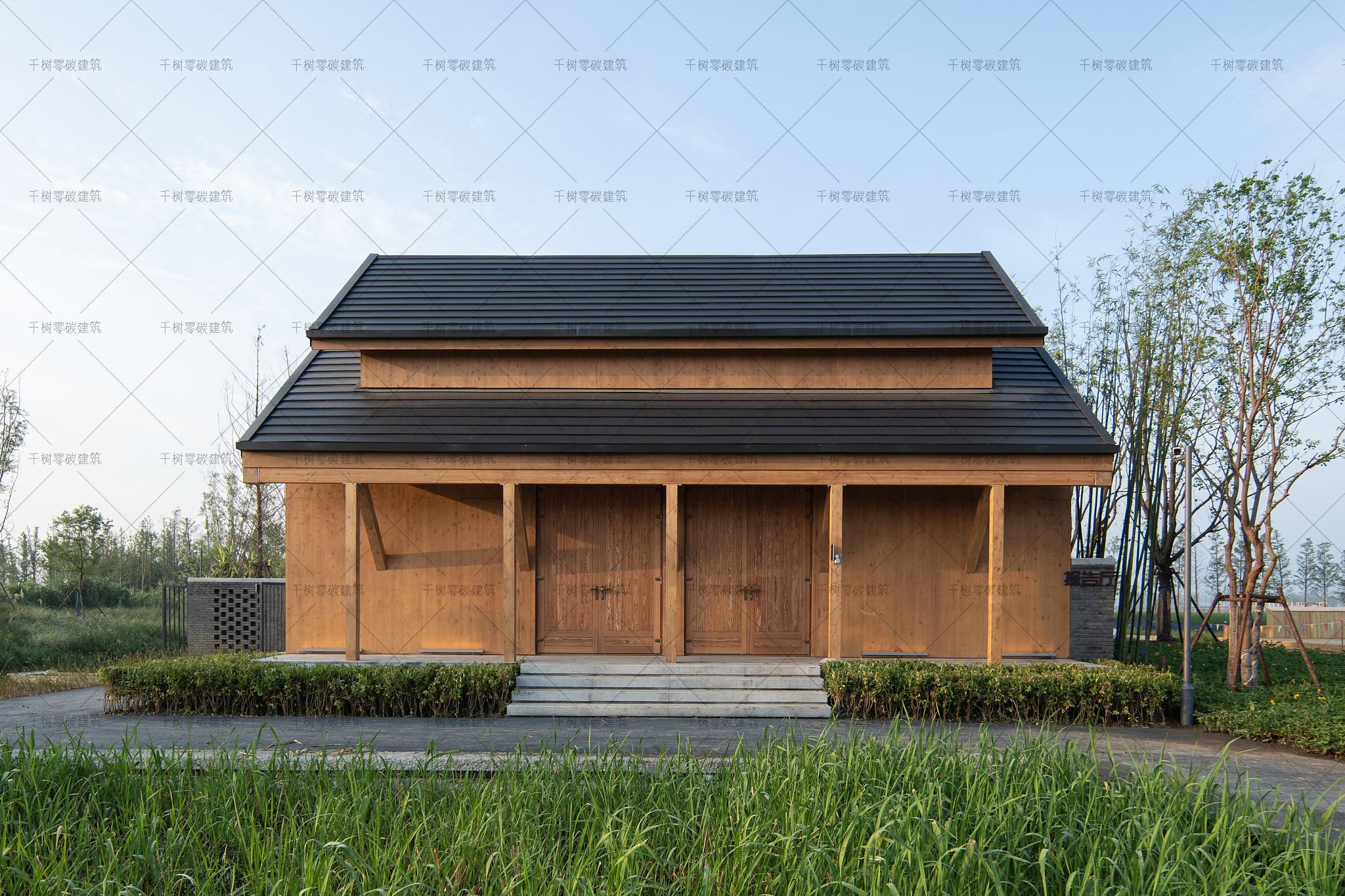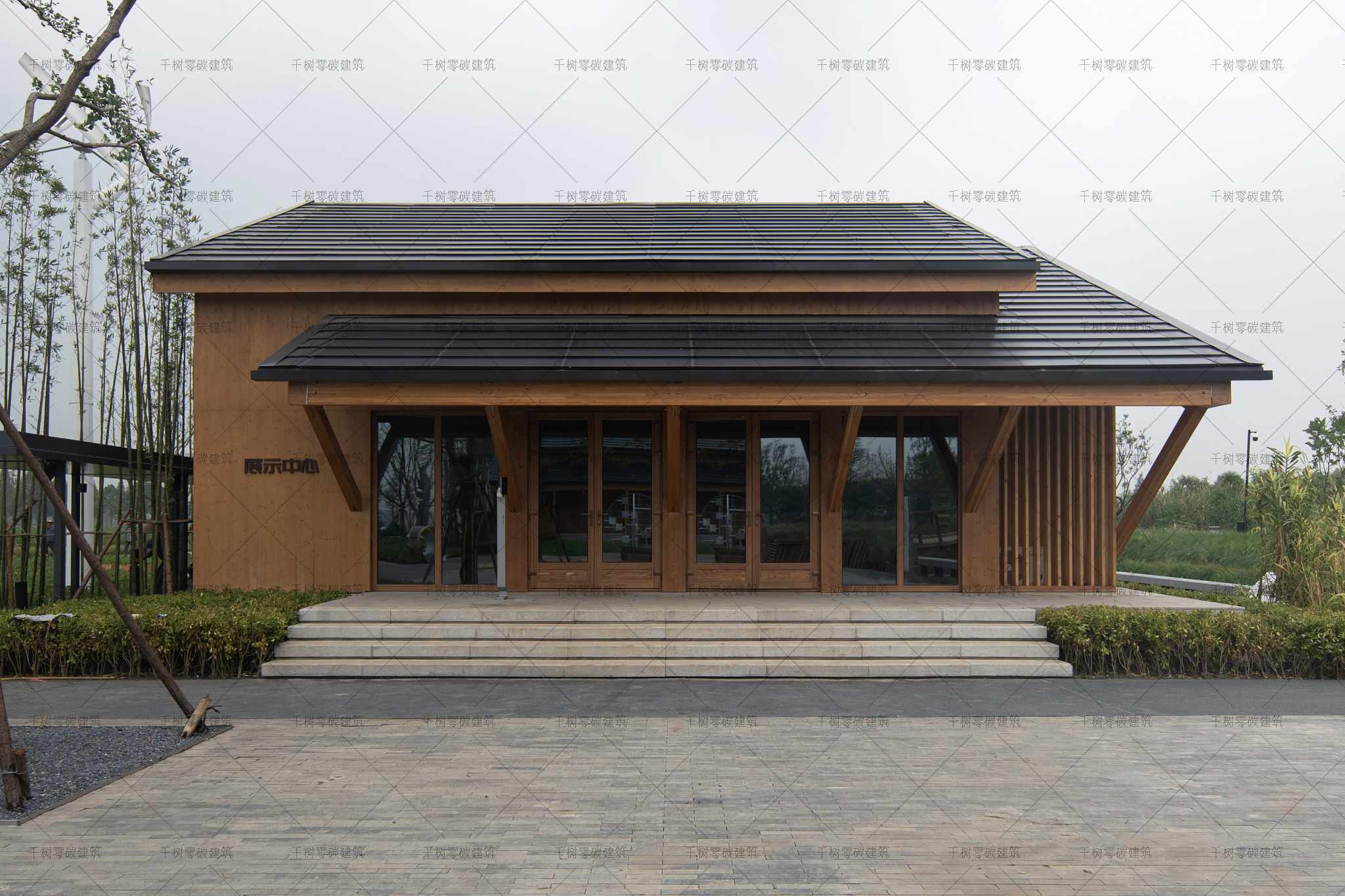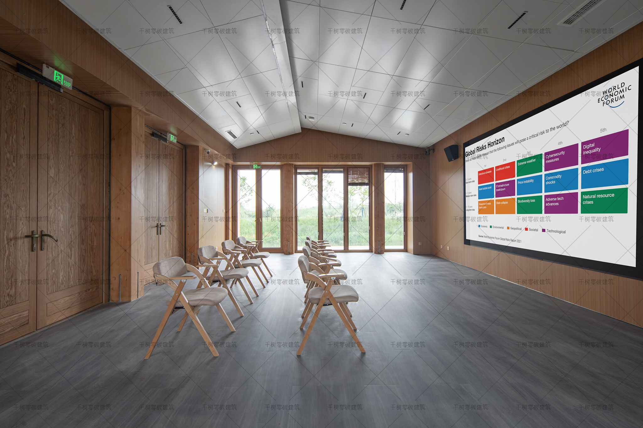 報告廳木屋和展示中心木屋墻面采用隔氣膜+內(nèi)外雙層保溫(內(nèi)保溫184mm厚,外保溫70mm厚)+CLT正交膠合木飾面板,屋面采用隔氣膜+保溫(屋面保溫235mm厚)+光伏瓦的圍護結構,門窗采用被動式節(jié)能阻燃木門窗(內(nèi)置遮陽百葉),加上高能效的技術設備:地源熱泵系統(tǒng)、風力發(fā)電系統(tǒng)、建筑光伏一體化系統(tǒng)、光儲直柔系統(tǒng)、熱回收系統(tǒng),通過可視化的智慧運維管理平臺高效監(jiān)管、智慧運算,綜合管控與整治,最終實現(xiàn)了零碳建筑的目標。
