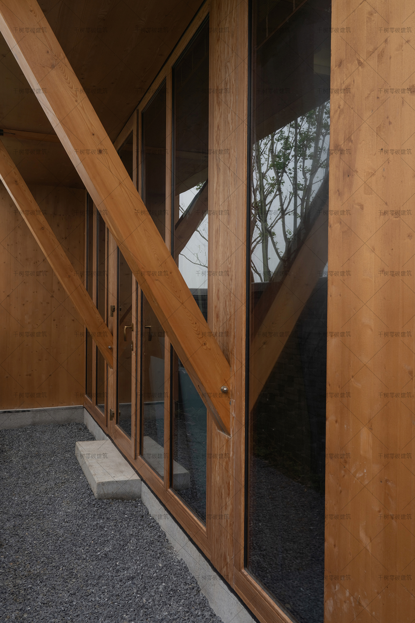 我司負責展示中心木屋和報告廳木屋的深化設計、制作安裝工作,展示中心木屋和報告廳木屋采用膠合木梁柱框架結構,花旗松同等組合膠合木,強度等級為TCt32。展示中心木屋和報告廳木屋按照被動式房屋進行深化設計,除高能效的技術設備之外,打造了保溫性能良好的圍護結構。隔氣膜設置在外保溫和框架梁柱之間,既保證了氣密層的連續(xù)性,又方便施工。門窗采用了被動式實木門窗,配置三玻兩腔鋼化節(jié)能玻璃,門窗型材由俄羅斯黃楊木重組而成,密度達到1200kg/m3,耐火等級達到B1級。在深化設計階段,外飾面由木紋金屬板更改為CLT正交膠合木飾面板,不僅保證了建筑設計立面效果,又達到了節(jié)能減碳綠色生態(tài)的目標。
