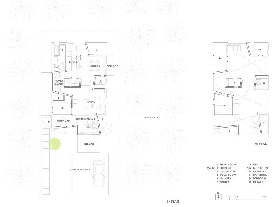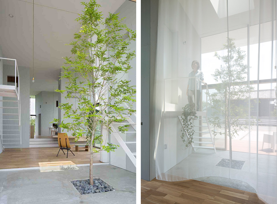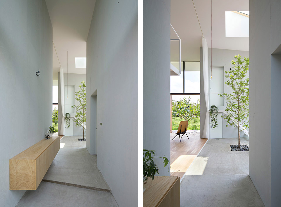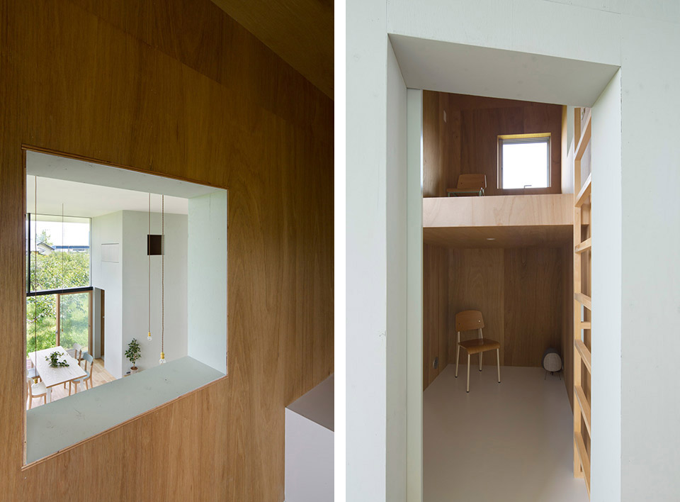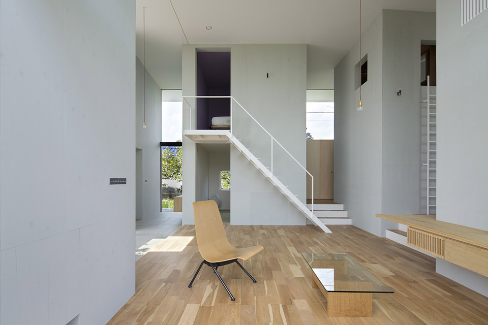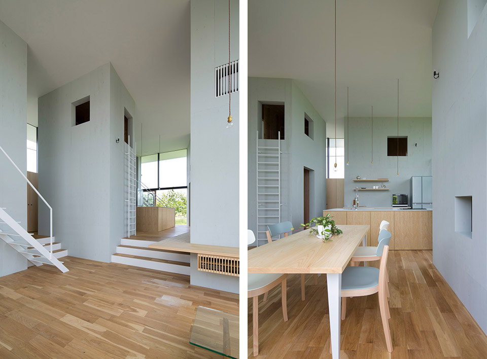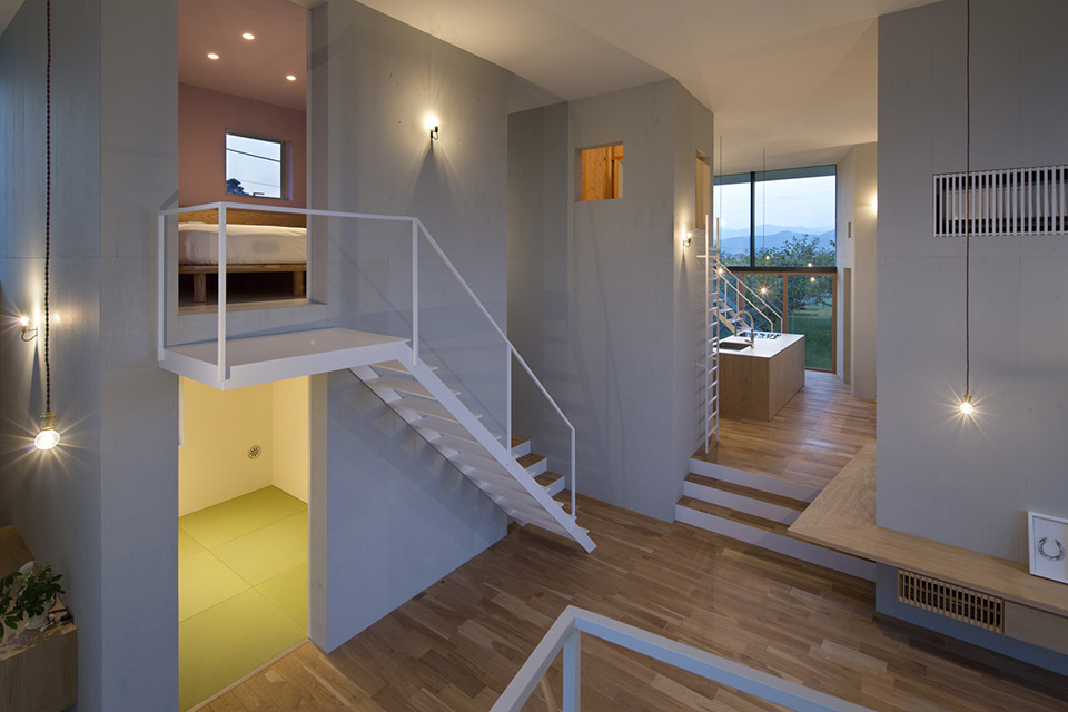 對(duì)自然開(kāi)放,并受到果樹(shù)圍繞的室內(nèi)公共空間讓人感到開(kāi)闊而放松。公共空間的室內(nèi)高度有兩層層高的尺度,為了利用結(jié)構(gòu)體的上層空間,每個(gè)都有專用樓梯到達(dá)上層,其中四個(gè)樓梯放置在公共空間中,還有三個(gè)爬梯分別放置在相對(duì)應(yīng)的結(jié)構(gòu)體自身中。