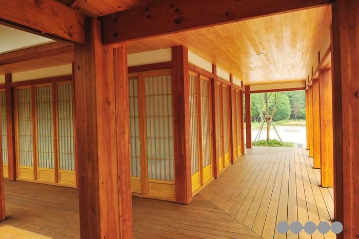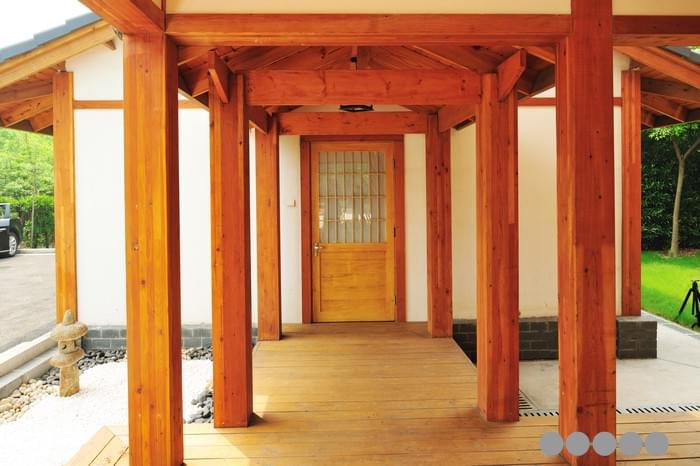 百花園日式木建筑四周有日式的圍廊和陽臺,但采用的是花旗松膠合主柱和鐵杉防腐木地板。一樓和二樓均采用了大面積的和式移動門窗,裝飾以日本進口的幛子紙,透光而不透視,而所有日式門窗均采用溫潤細膩、耐腐抗變形的加拿大黃柏。循花旗松實木樓梯拾級而上,是日式茶室、辦公會客室、休息室和秘書室等功能區(qū)劃。整個室內(nèi)裝飾以針葉材實木板條和流白為主,地面是十分日本式的青石板,頂部的日式燈具均用直紋的花旗松實木在工廠定制而成。