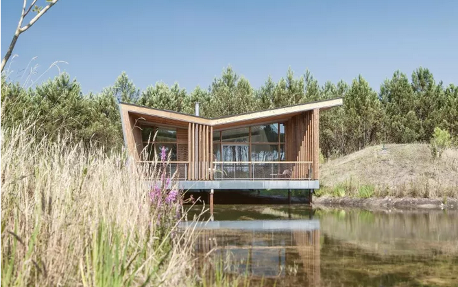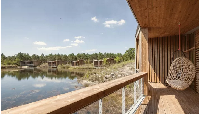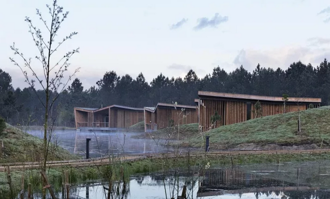 項目中所運用的斜線,以及接待處微微傾斜的角度與后面的圓形沙丘和線性冠層形成鮮明的對比。建筑與環(huán)境之間的和諧關系不是建立在模仿的基礎上,而是由一種截然相反的同源性來定義的。這些小的、獨立的單位被安置在水面上,它們是景觀中的一個重要的節(jié)點,與自然共同形成一個持續(xù)的有機環(huán)境。不同的路徑在山之間蜿蜒盤旋,以基地上各種不同的視角,你可以清晰地感覺到它的真實性。