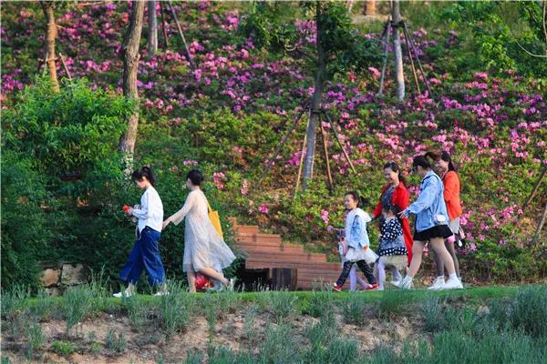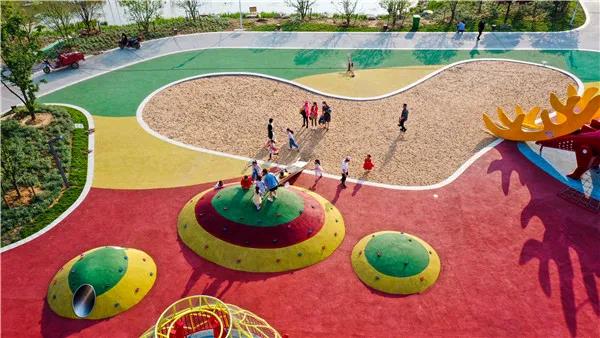 與花海兩兩相望的親子樂園,孩子們的歡笑聲隨著秋千飄到天上,推秋千的大人難掩笑意,人與人之間變得柔軟。