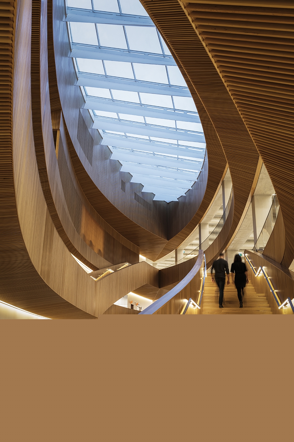 底層的外立面并未使用透明的六邊形,而是設(shè)計(jì)成了凹進(jìn)去的寬闊木質(zhì)拱頂,人們在進(jìn)入圖書館的時候會產(chǎn)生被環(huán)抱的感覺。圖書館入口處結(jié)構(gòu)參考了當(dāng)?shù)爻R姷腃hinook云拱。入口處的雙曲面木質(zhì)拱廊是世界上最大的自由曲面木質(zhì)外殼之一,材質(zhì)選用了不列顛哥倫比亞省西部產(chǎn)的紅杉木。其有機(jī)形態(tài)和質(zhì)感讓大型建筑的尺度變得親密。從圖書館外面就能看到中庭,仿佛在邀請人們進(jìn)入。