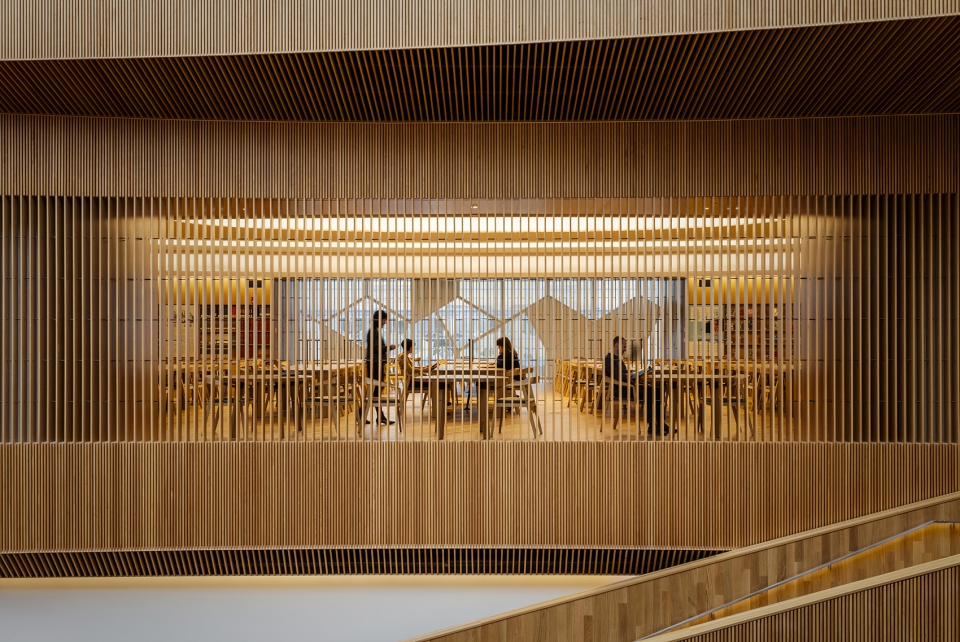 圖書館共有六層,分布著各種空間,比如數(shù)字空間,模擬空間,群體空間以及個人互動空間。圖書館頂層是大閱覽室,建筑師在設(shè)計(jì)時,把它構(gòu)想成藏在圖書館的珠寶盒,人們可以在這兒潛心研究,尋找靈感。進(jìn)入大閱覽室之前要先經(jīng)過一個過渡空間,過渡空間光線柔和,聲效優(yōu)良。室內(nèi)利用木質(zhì)格柵而非實(shí)體墻壁來環(huán)繞空間,這樣既保證了隱私,又有一定的可見度。陽光透過木條的縫隙照亮了中庭和西立面之間的空間。