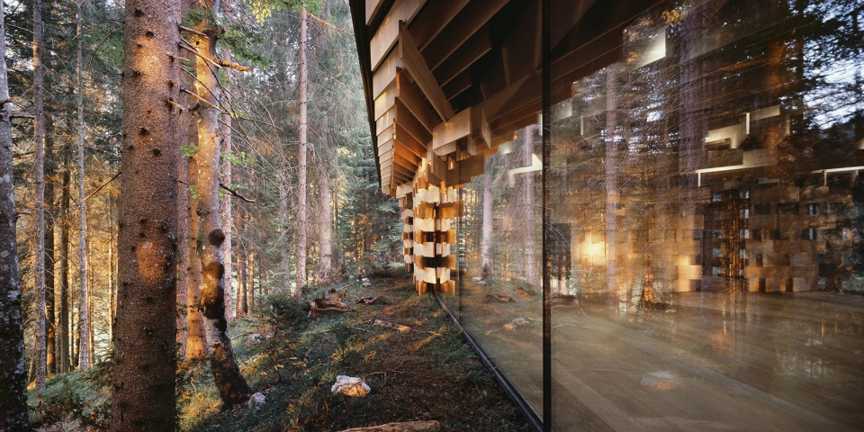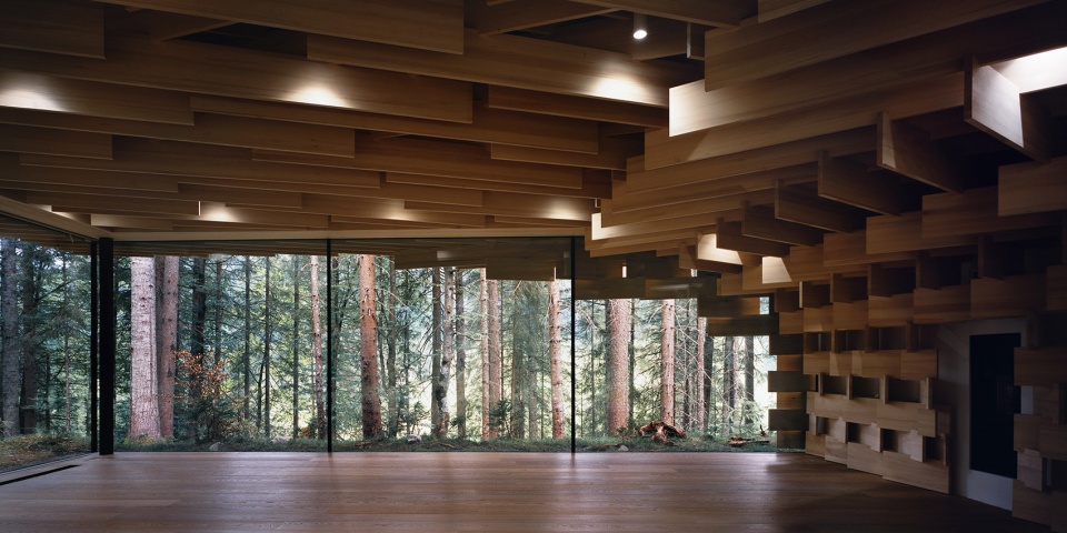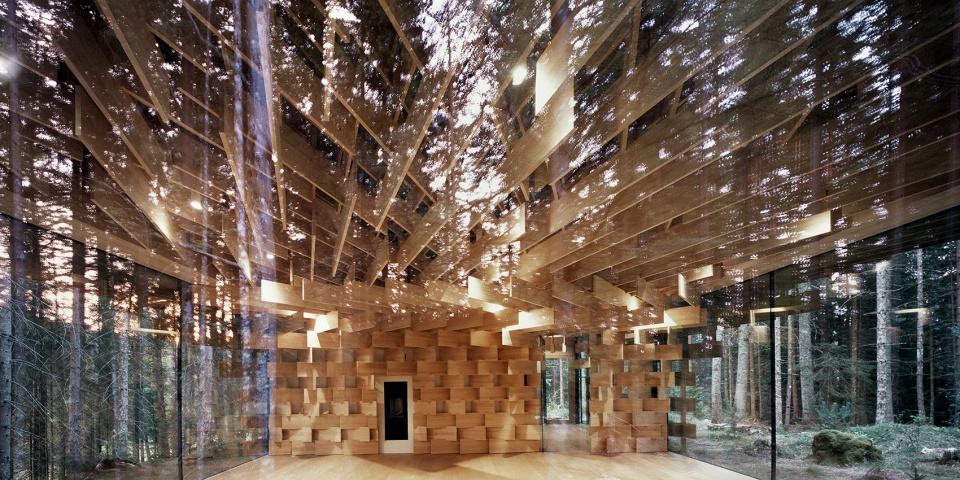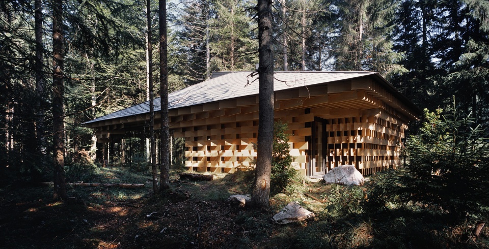 該建筑以生長(zhǎng)在場(chǎng)地附近的冷杉樹(shù)為主要材料,3厘米寬的木板像樹(shù)枝一樣堆疊起來(lái),在廣闊的森林和精致的建筑間形成一種柔和的過(guò)渡。小屋同樣也充當(dāng)了使人融入森林的媒介。陽(yáng)光透過(guò)枝葉間的縫隙從天窗透進(jìn)室內(nèi),帶來(lái)森林中常常可以體驗(yàn)到的“komorebi”(木漏れ日)般的效果。