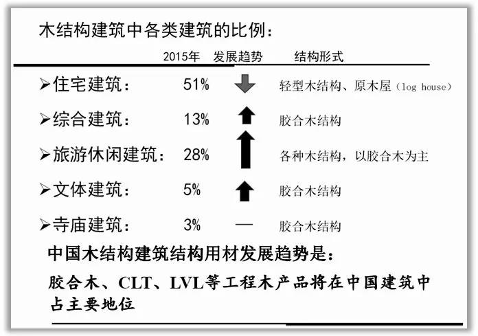 幾十年來,磚混結(jié)構(gòu)已廣泛應(yīng)用于我們的民用建筑中。施工成本低,給人以安全感,耐用性和低維護(hù)成本,而木結(jié)構(gòu)房屋不穩(wěn)定,不安全,易著火,易受害蟲害。遇水分會(huì)導(dǎo)致腐爛和霉變,因此難以接受這種新的木結(jié)構(gòu)建筑。由于對現(xiàn)代木結(jié)構(gòu)的理解不足,因而產(chǎn)生這些疑問是正常的。只要在成本,安全,保護(hù),功能等方面采取適當(dāng)措施,通過大量的實(shí)驗(yàn)比較,專業(yè)知識(shí)的宣傳,樣板房的示范,特別是中國古代木結(jié)構(gòu)建筑和文化的影響,我相信人們的思想會(huì)發(fā)生變化,而木結(jié)構(gòu)建筑的生活體驗(yàn)也會(huì)影響人們的固有觀念。現(xiàn)代木結(jié)構(gòu)完全可以被接受。下圖所示的各類木結(jié)構(gòu)建筑發(fā)展趨勢也能說明這一點(diǎn)。