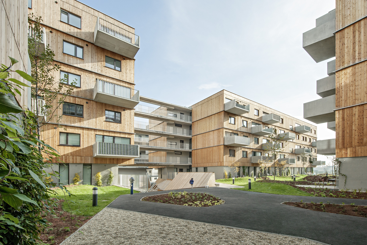 各個部分通過三排南北方向的通道平臺相互連接。這三條流通路線通過一系列采光樓梯、內(nèi)部走廊和開放的通道平臺,提供了不同的空間體驗。串行的線性基本結(jié)構(gòu)為布置不同類型的公寓提供了極大的靈活性,因此允許居民的交流。公寓平面圖的設(shè)計非常靈活。它們可以在以后以各種方式改變。盡管它們有一個很好的能源平衡,但建筑仍然向外開放。結(jié)合使用木材作為建筑材料,使整個建筑群既輕盈又有深度。