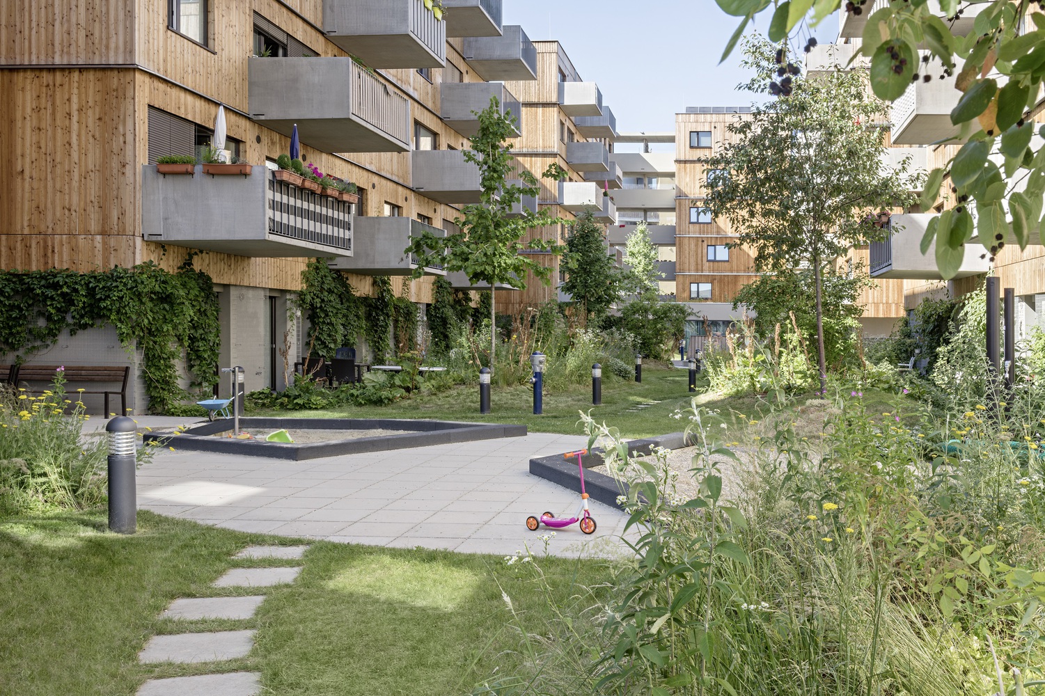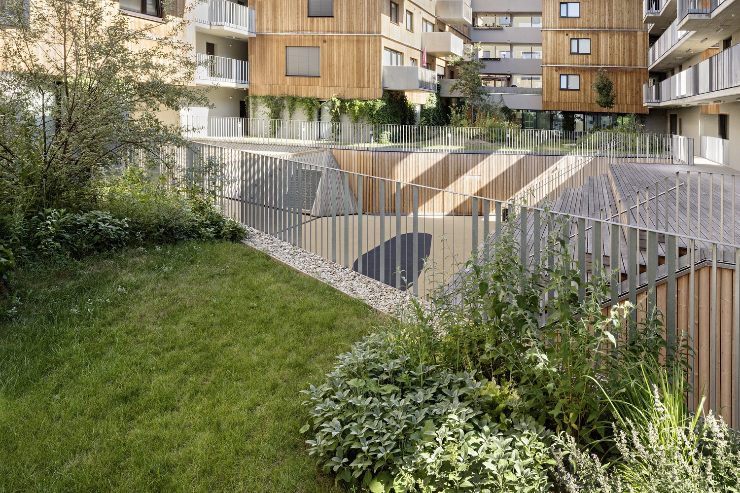 綠色的庭院與一些長滿青草的小山丘一起,形成了一個有機的景觀,這些庭院的翼形梯田有意地凸顯在中央庭院的中間。山丘、樹木和帶小樹冠的灌木遮擋了私人露臺。通往丘陵景觀的道路網(wǎng)絡(luò)被刻意限制,以防止走廊式路線的發(fā)展。在入口區(qū)、洗衣房和兒童游樂場前的路口形成了聚會場所。