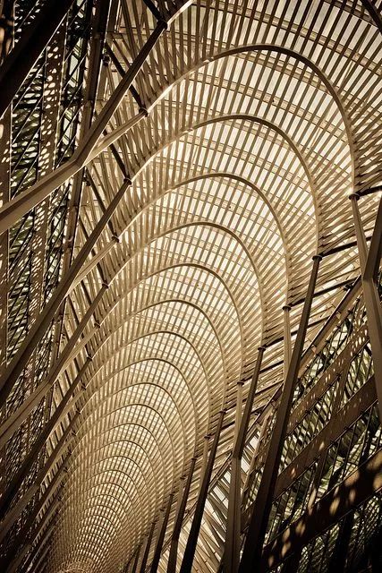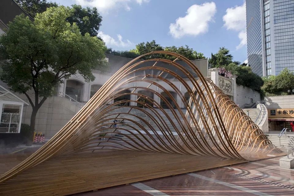 為了達(dá)到更輕薄的形體效果,建筑主體采用竹鋼搭建,豎向的立柱每根都為承重住,從而達(dá)到均勻受力的效果。“柱”與“梁”的連接部分采用簡單的交錯堆疊起來進(jìn)行構(gòu)造的方法,使其在形式上產(chǎn)生出類似斗拱結(jié)構(gòu)的效果。