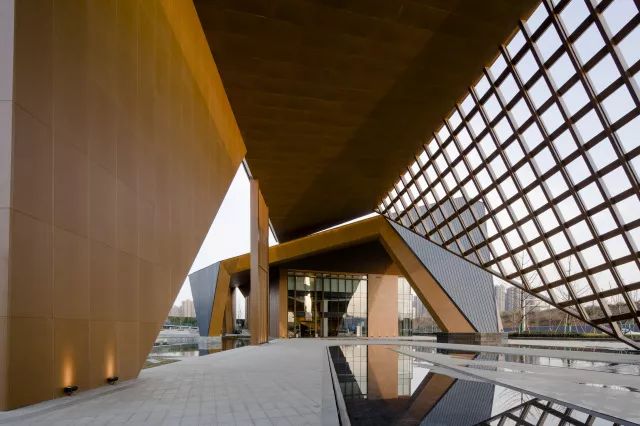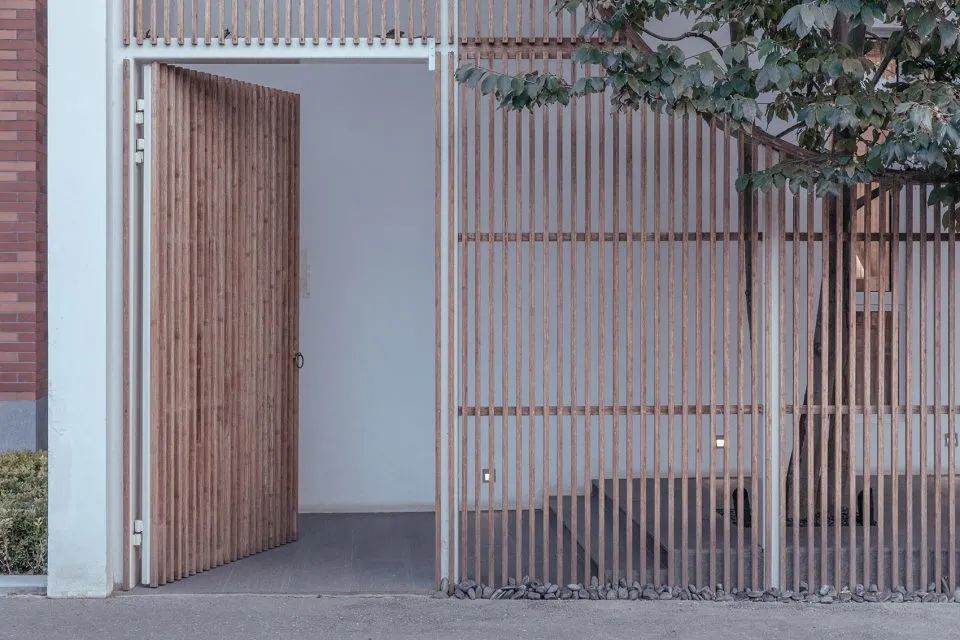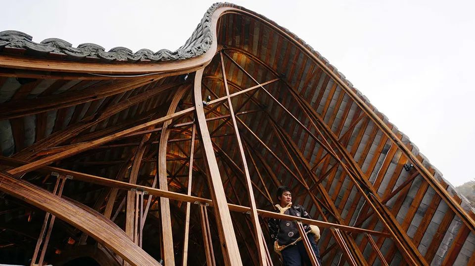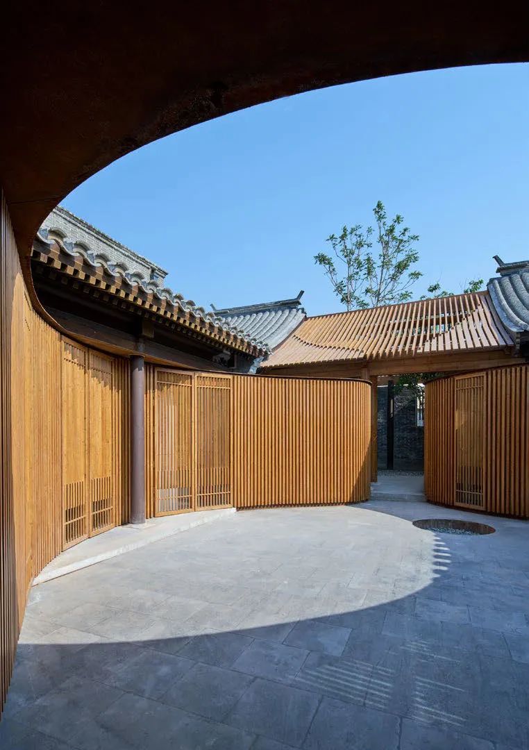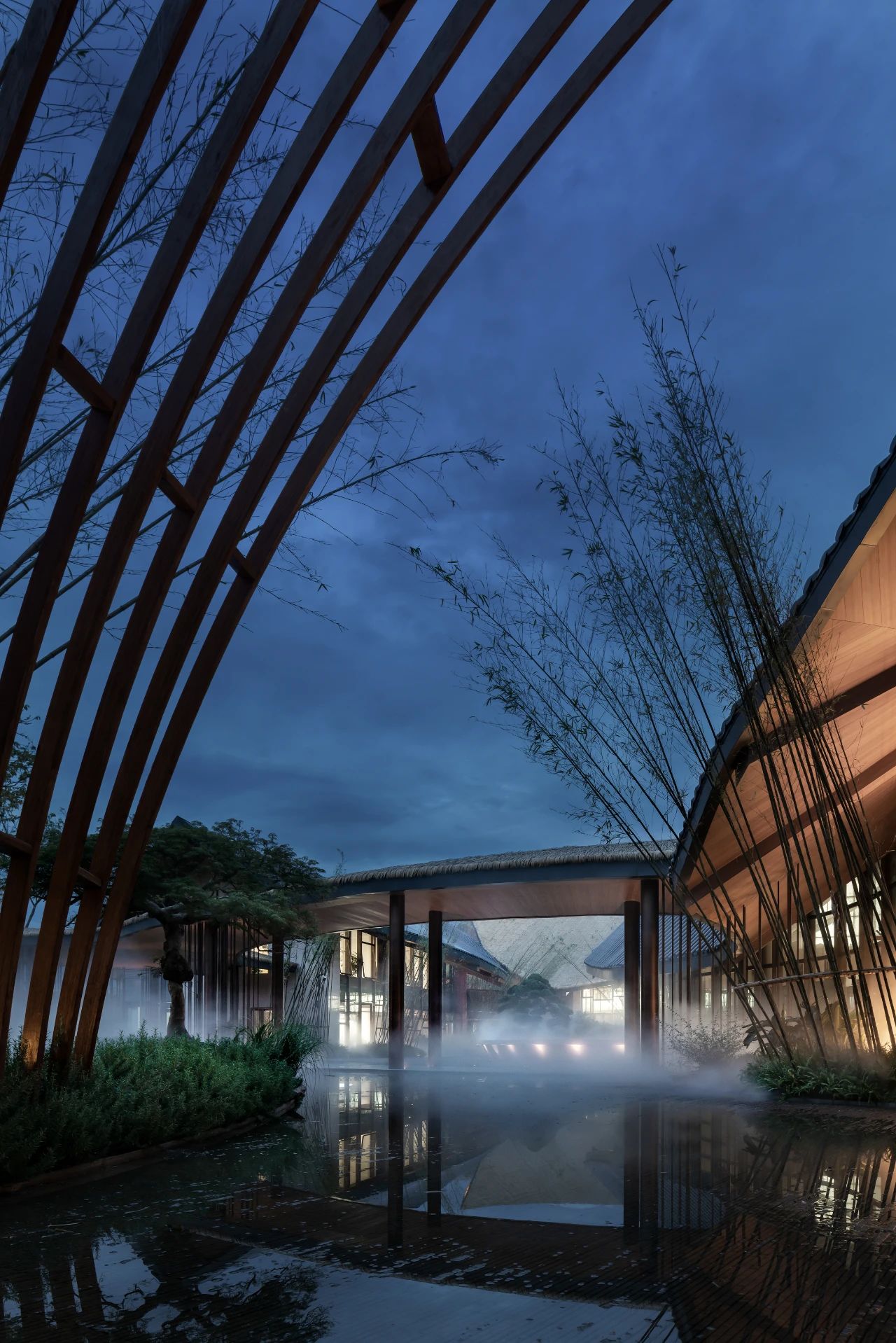曲面屋頂聯(lián)系起整個建筑群落,豎向的桿件結(jié)合曲面屋面,組成自由、輕盈的建筑形態(tài),取材延續(xù)中國古建筑的質(zhì)樸自然,借助青瓦、鋼木等,打造建筑的原始與本真,釋放出閑適愜意的空間氛圍。