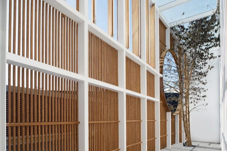 屋頂用原先木架尺寸的竹鋼梁架搭接,椽子采用十字交叉竹鋼構(gòu)件組合,在小院的正上方勾勒出葫蘆形的輪廓,通透的竹鋼板屋面一方面呼應(yīng)了原有屋瓦的尺度,又形成屋面中間更為通透的效果,給屋中小院引入充足的陽光,便于樹木生長。