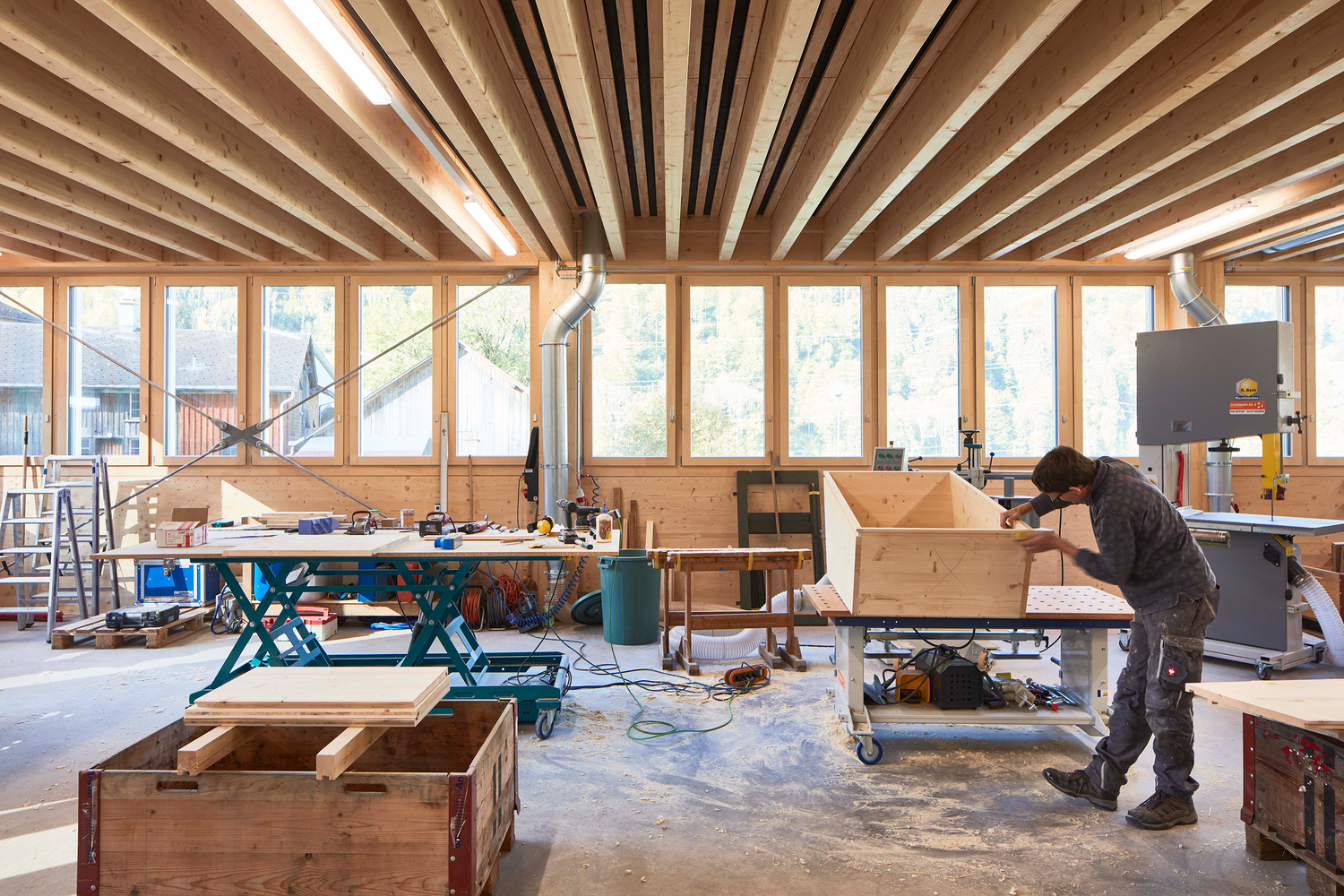 這是位于瑞士一個(gè)叫做Matt小村莊中心的一座木屋,在一場大火燒毀了原始生產(chǎn)設(shè)施后,木結(jié)構(gòu)建筑公司新的一座替代建筑。新的大廳與舊的大廳很相似,但是建筑整體的建造缺融入了很多新的思考。木材因其無限的可能性而被選為主要的建筑材料。