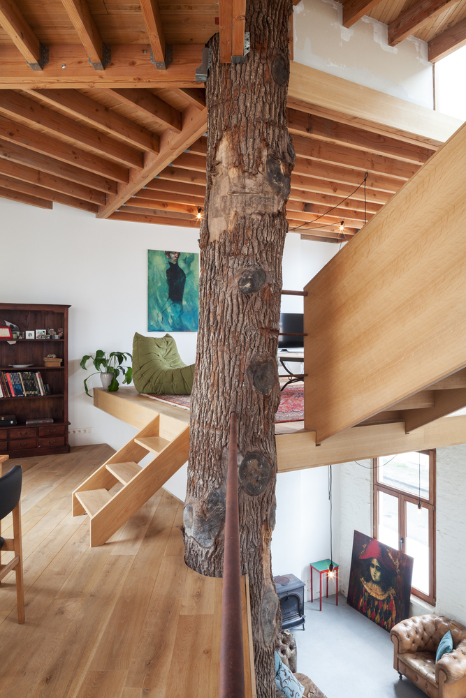 一段橡樹樹干被放置在五邊形平面正中間,作為新的支撐結(jié)構(gòu)。新的上層樓層懸掛在原有外墻和中心支柱之間,呈螺旋式上升。這樣就在生活區(qū)域內(nèi)創(chuàng)造出沒有任何內(nèi)墻的開放室內(nèi)空間。樹干中柱是一個合乎邏輯且經(jīng)濟實惠的解決方案,它立即為新居所帶來了合適的氛圍。衛(wèi)生間、廚房、入口和儲藏室/洗衣房都設(shè)置在縱貫上下的封閉體塊中。