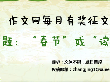 歡迎大家來到作文網(wǎng)(m.compalm.net.cn)每月征文活動(dòng)專區(qū),在這里,你可以遨游在浩瀚豐富的作文寶庫,盡情品味精彩文章,提升寫作水平,讓進(jìn)步伴隨你的左右。每月參與一次征文活動(dòng),在輕松的寫作中體味快樂,在作文的海洋展示文學(xué)才華,不要再把作文拘泥于任務(wù),讓我們用手中的筆,記錄下每一次成長的快樂吧! 本月征文主題“春節(jié)”或“讀《xx》有感”,作文體裁不限、字?jǐn)?shù)不限!快拿起您的筆,告訴我們,在喧囂的都市和日益都市化的鄉(xiāng)鎮(zhèn),在您的心里,您渴望的春節(jié)是什么樣的,春節(jié)應(yīng)該被賦予什么含義?您想如何度過?為春節(jié)重新定義嗎?在這個(gè)寒假里,你又讀了什么名著嗎?快來暢所欲言說說你的感受!您的來稿會(huì)發(fā)布到學(xué)而思作文網(wǎng)(點(diǎn)擊進(jìn)入),我們還有權(quán)威的專家給你點(diǎn)評,期待廣大網(wǎng)友和同學(xué)們積極參與!獲獎(jiǎng)文章有可能被雜志采納哦! |